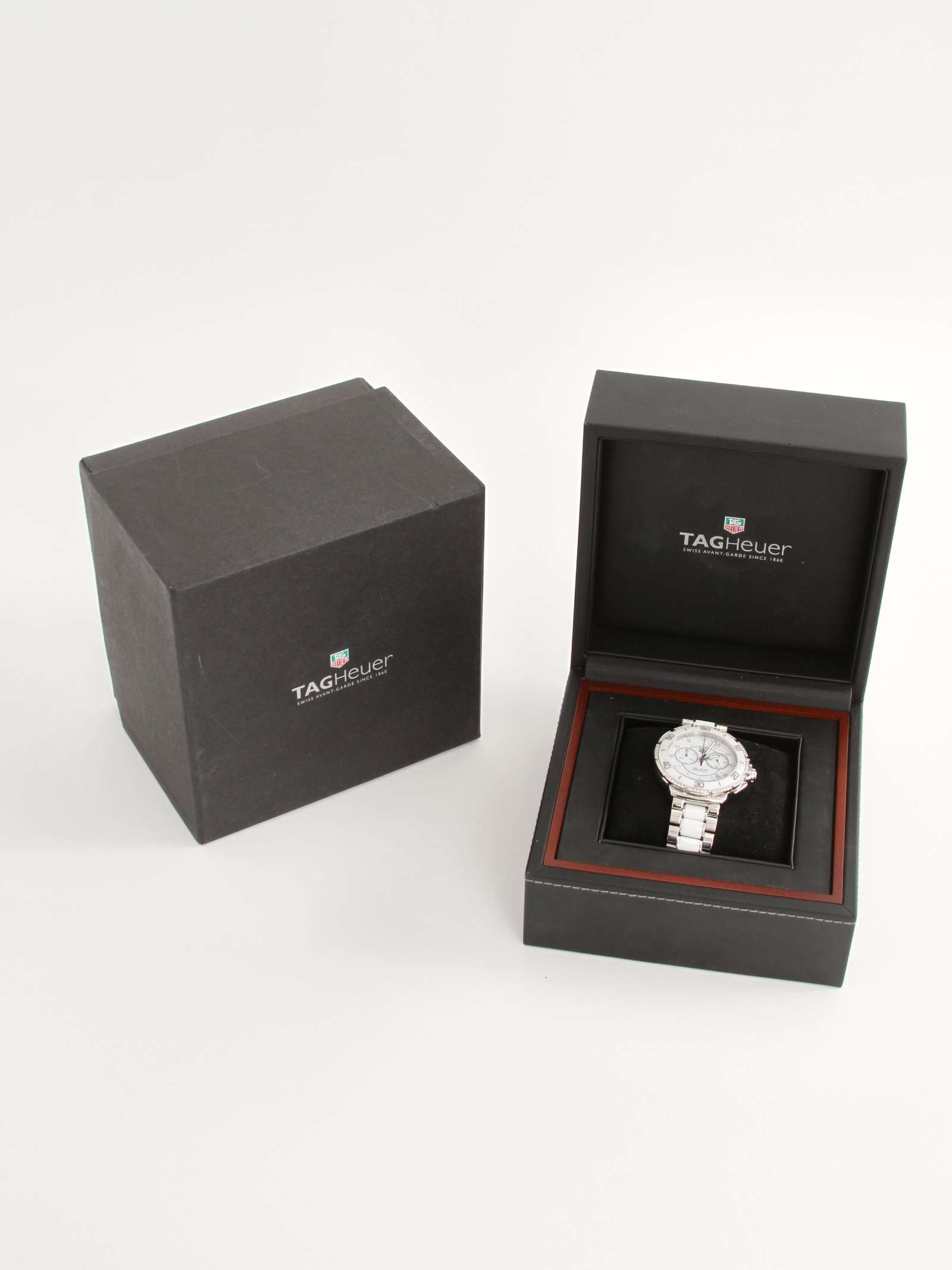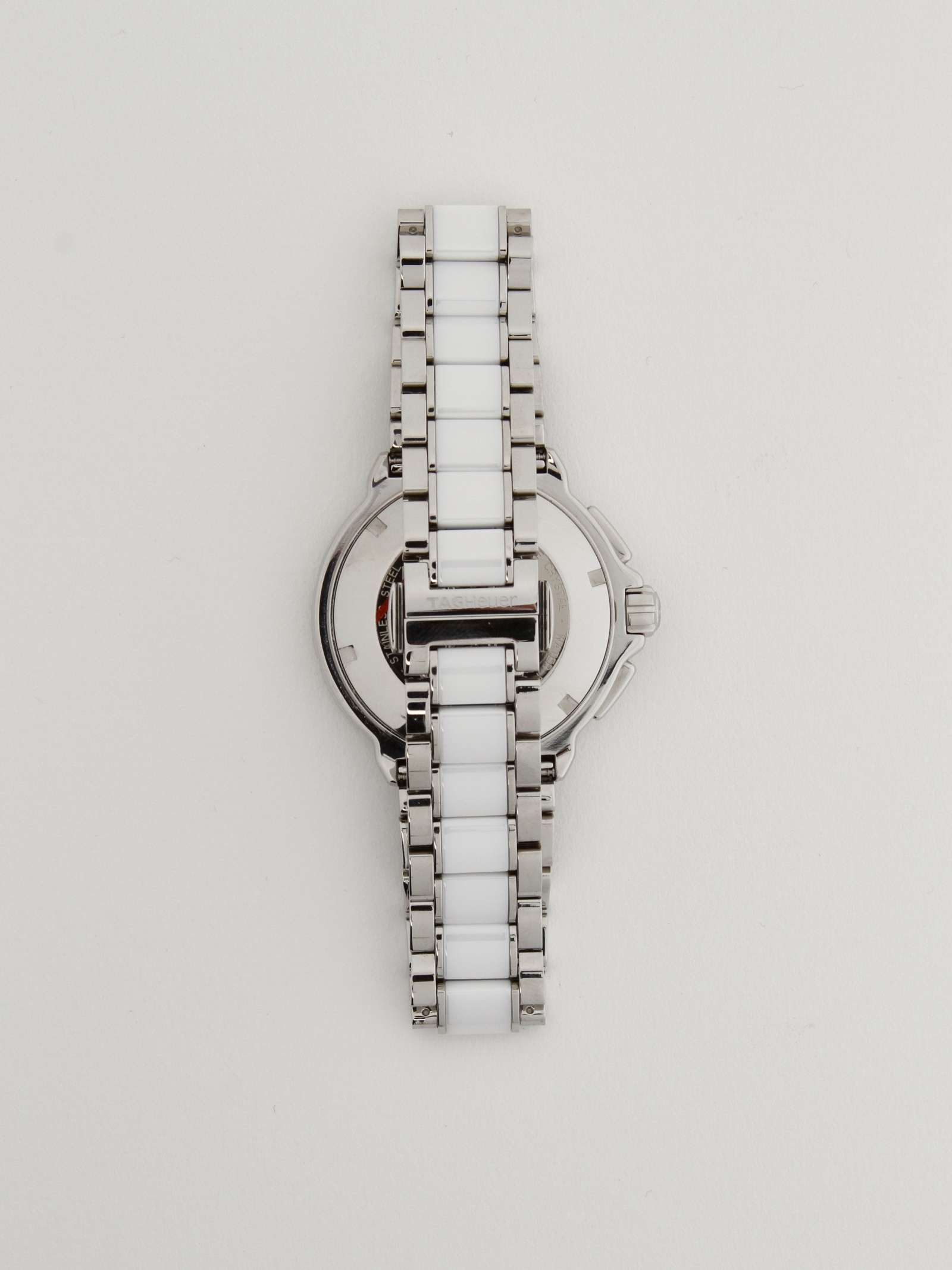 TAG HeuerTAG Heuer Formula 1 Watch. Корпус из нержавеющей стали. Браслет из нержавеющей стали с белыми керамическими центральными звеньями. Кварцевый механизм. Сапфировое стекло. Белый циферблат. Функция хронографа. Сопротивление воды 200M. Комплект: сертификат, футляр, коробка. Диаметр циферблата: 42мм. Длина ремешка: 18 см.