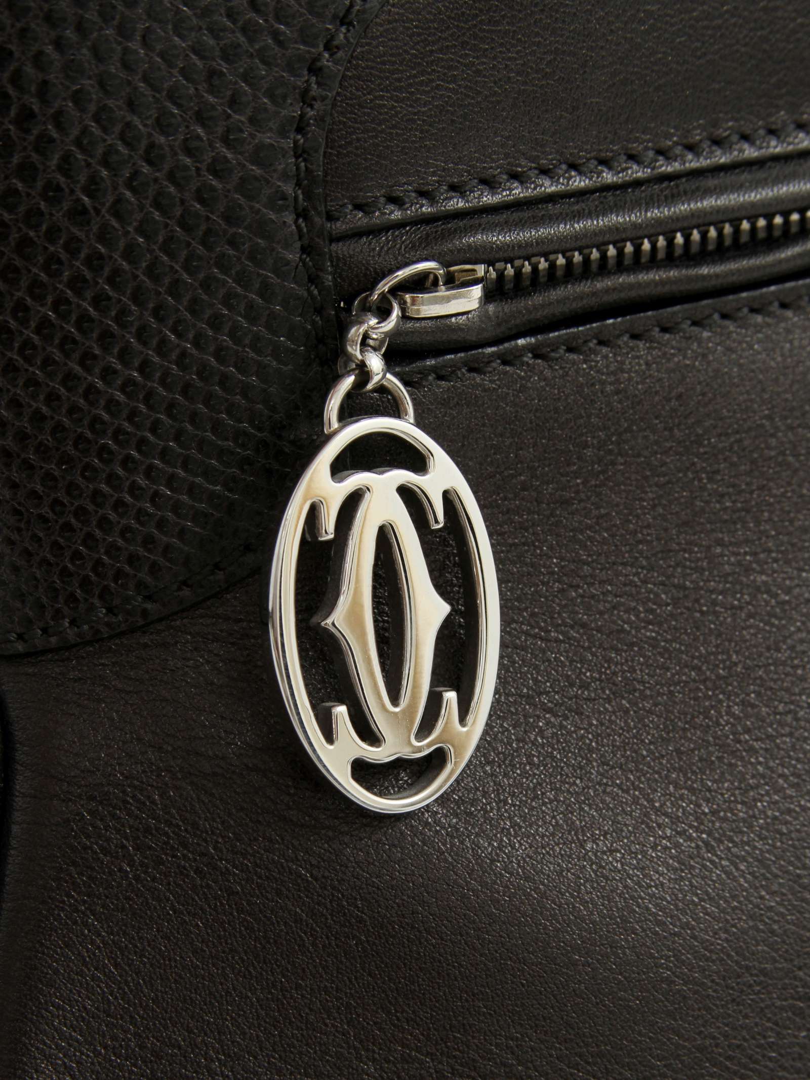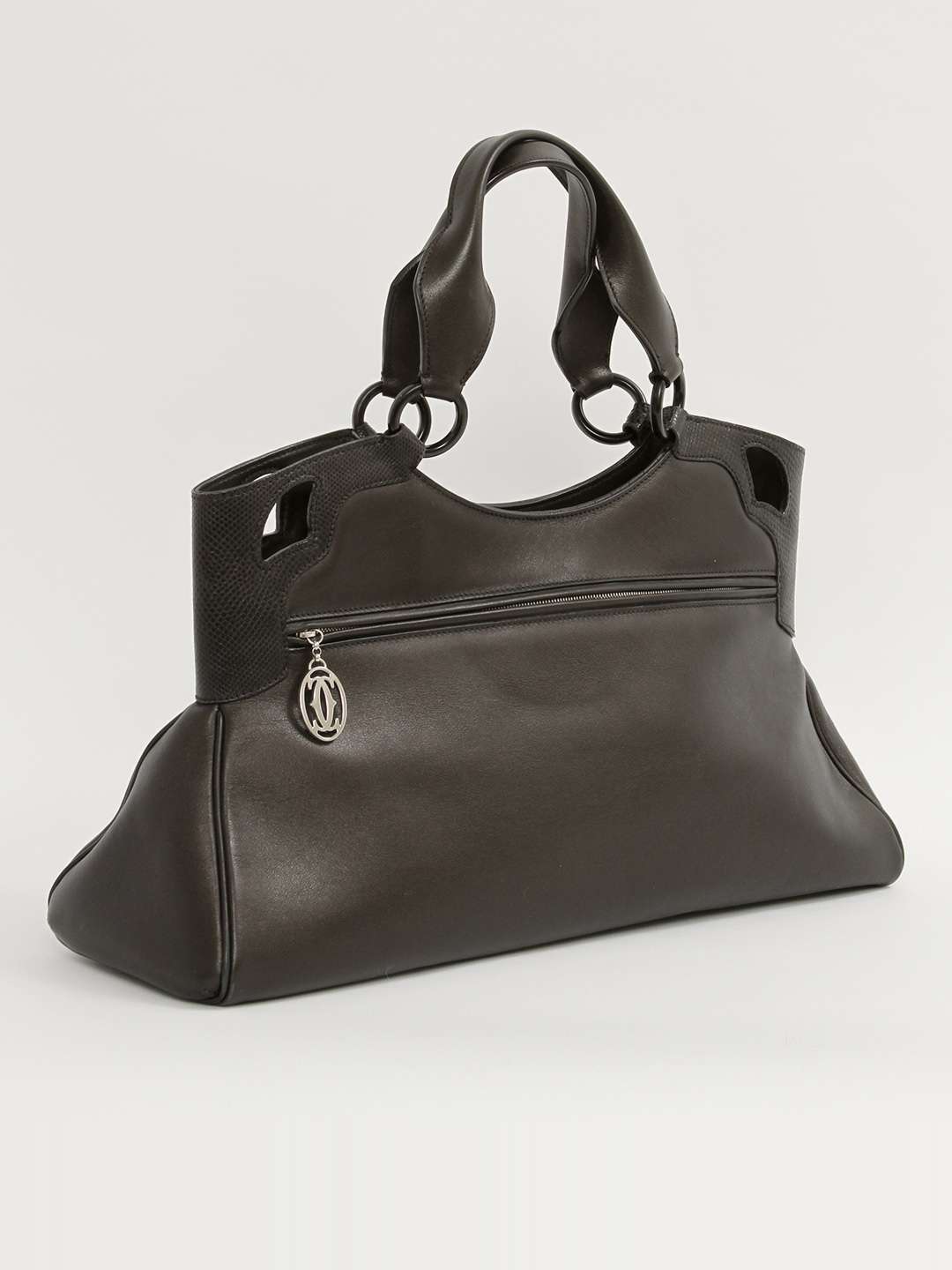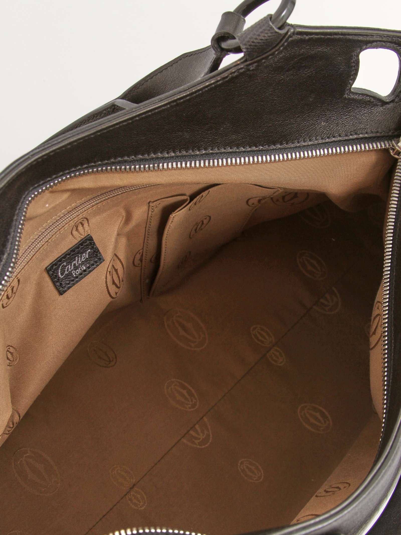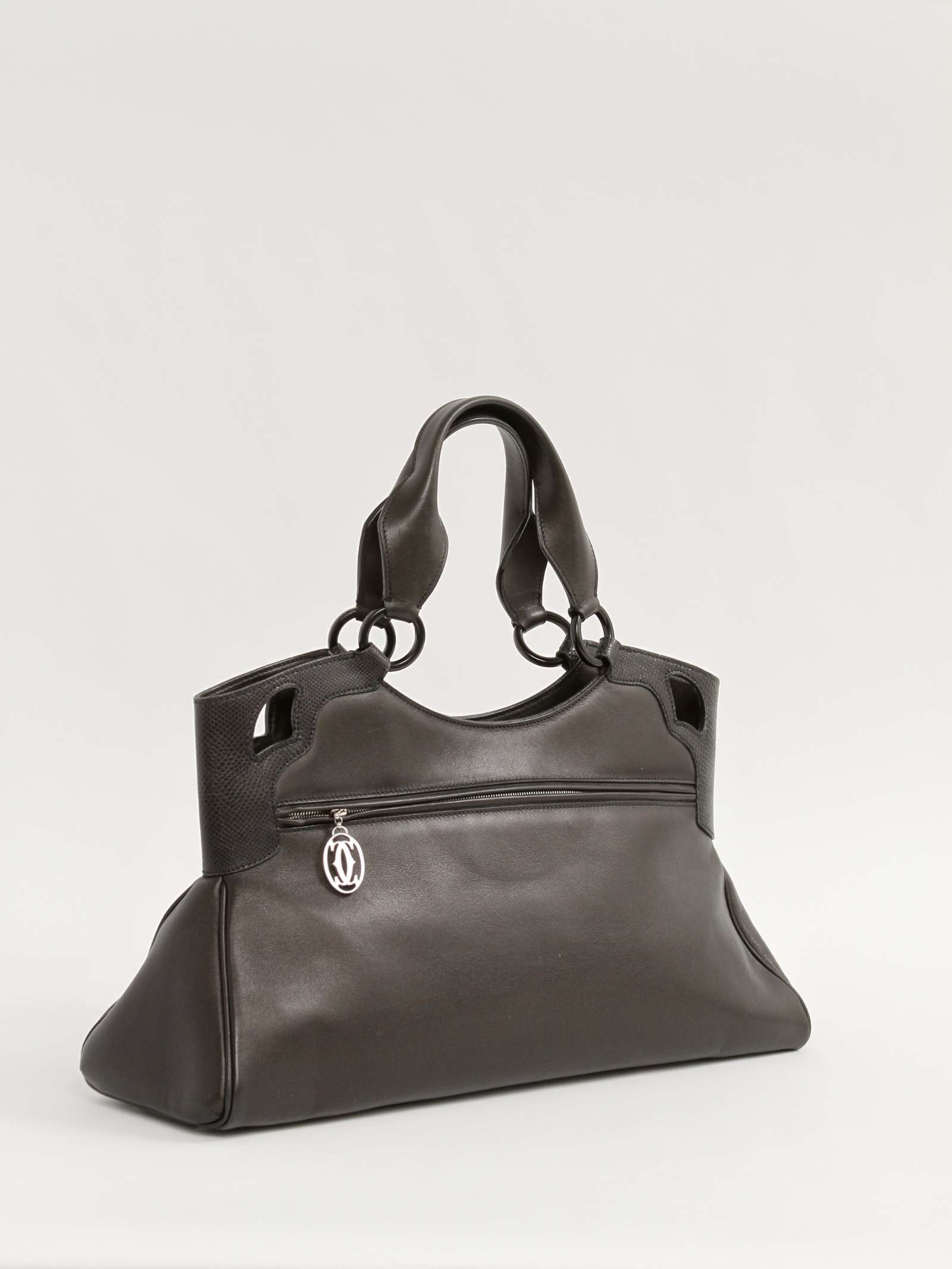CartierCartier Marcello. Модель выполнена из натуральной кожи, текстильная подкладка, серебристая фурнитура. Одно основное отделение, внутренний карман на молнии, внутренний накладной карман, внешний карман на молнии. Оснащена двумя плечевыми ручками и защитными ножками в основании сумки.