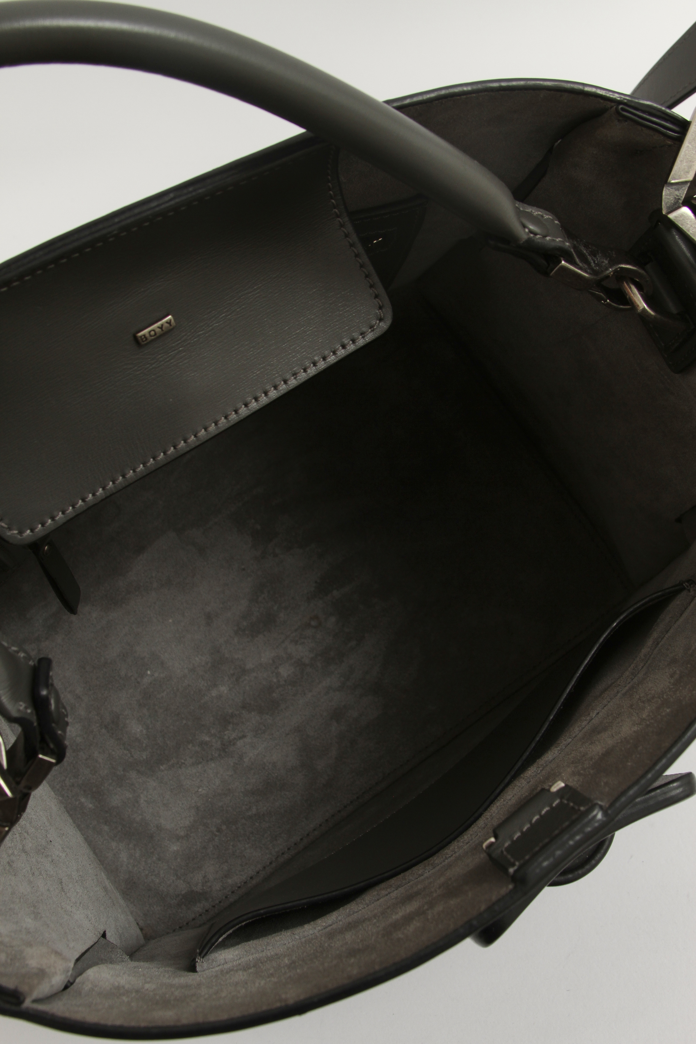 BOYYBOYY Devon. Модель выполнена из натуральной кожи, подкладка из замши, серебристая фурнитура. Одно основное отделение, внутренний карман на молнии, внутренний накладной карман. Оснащена короткой ручкой из кожи и съемным плечевым ремнем. Украшена ремнем и пряжкой из кожи.