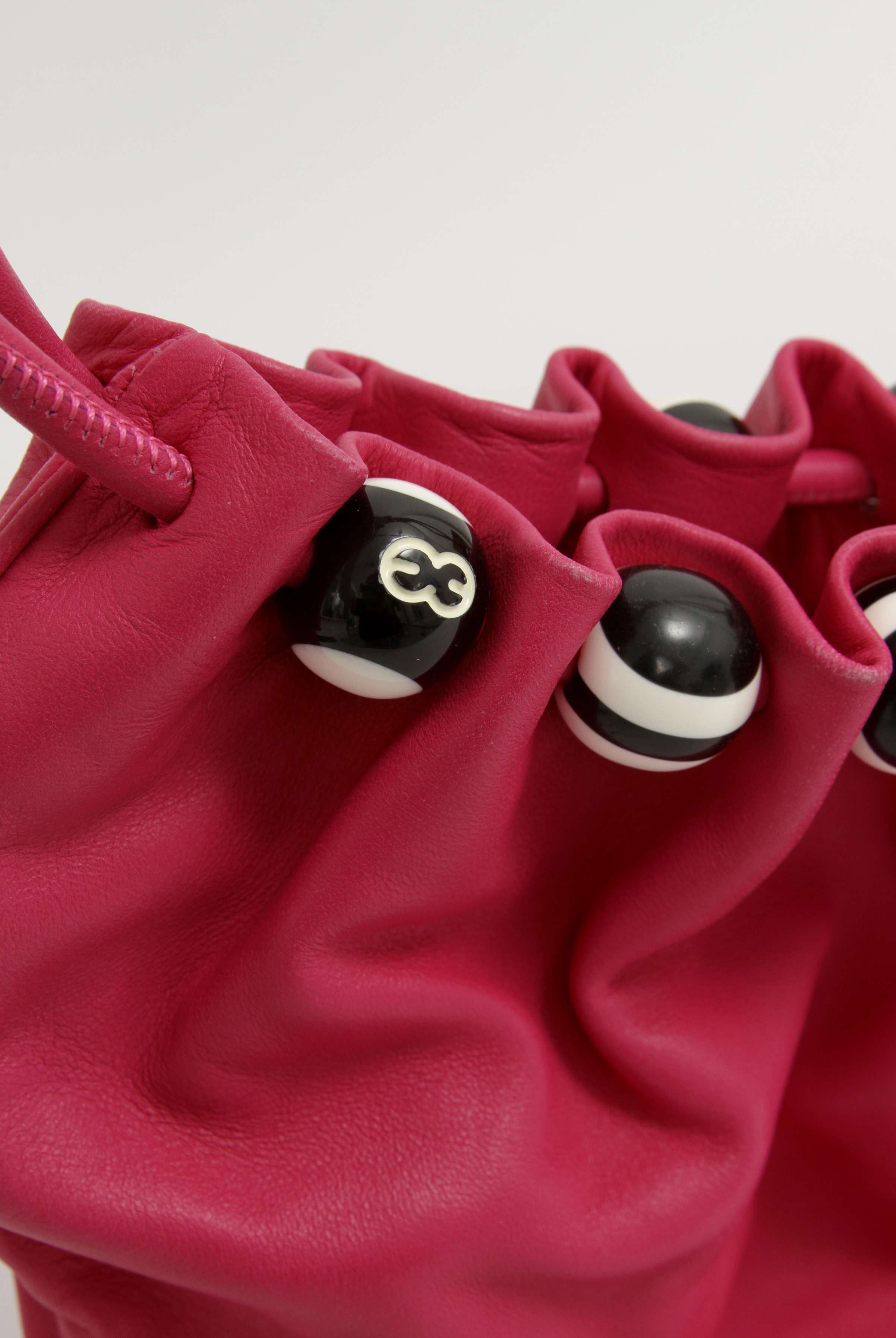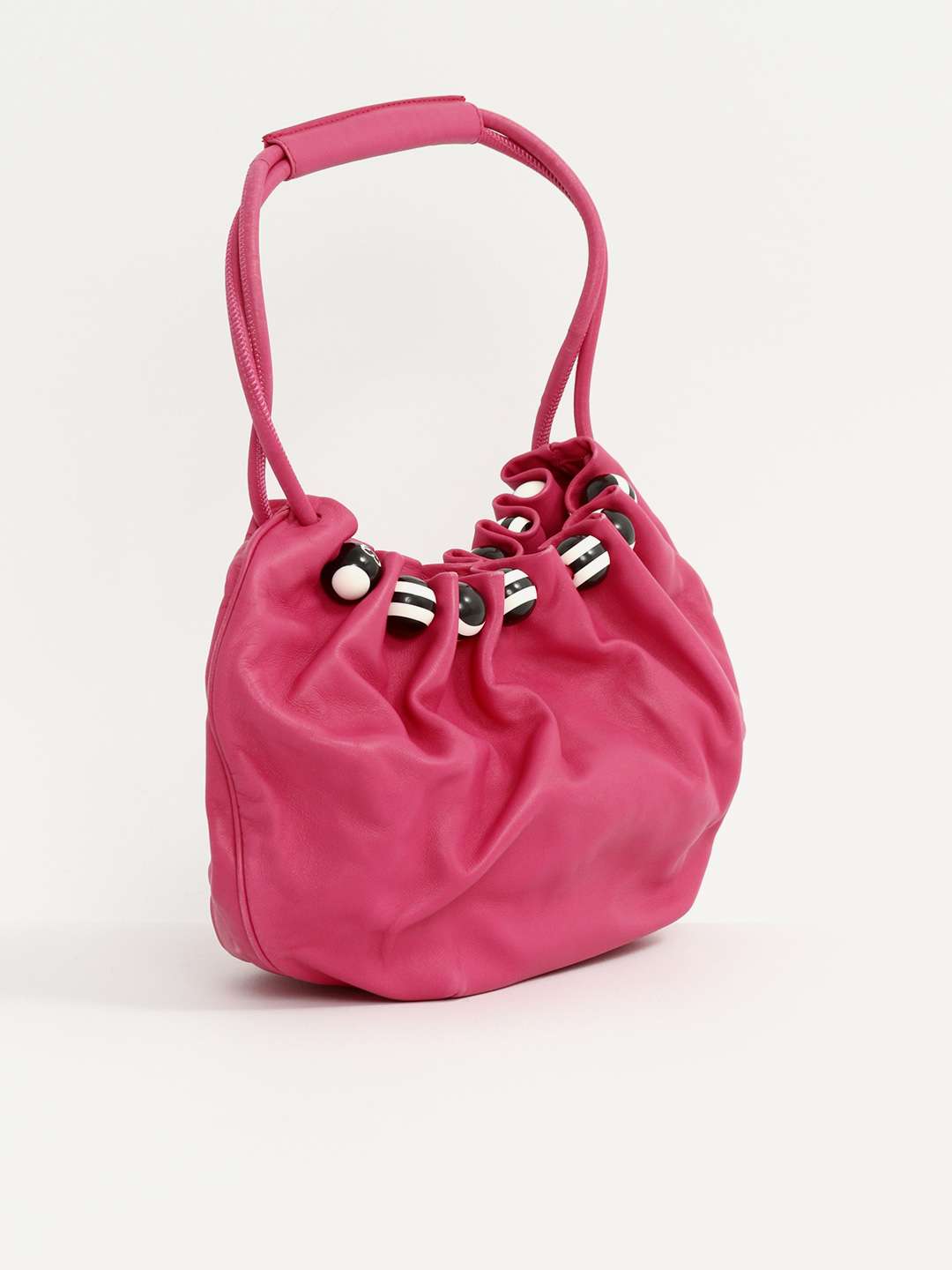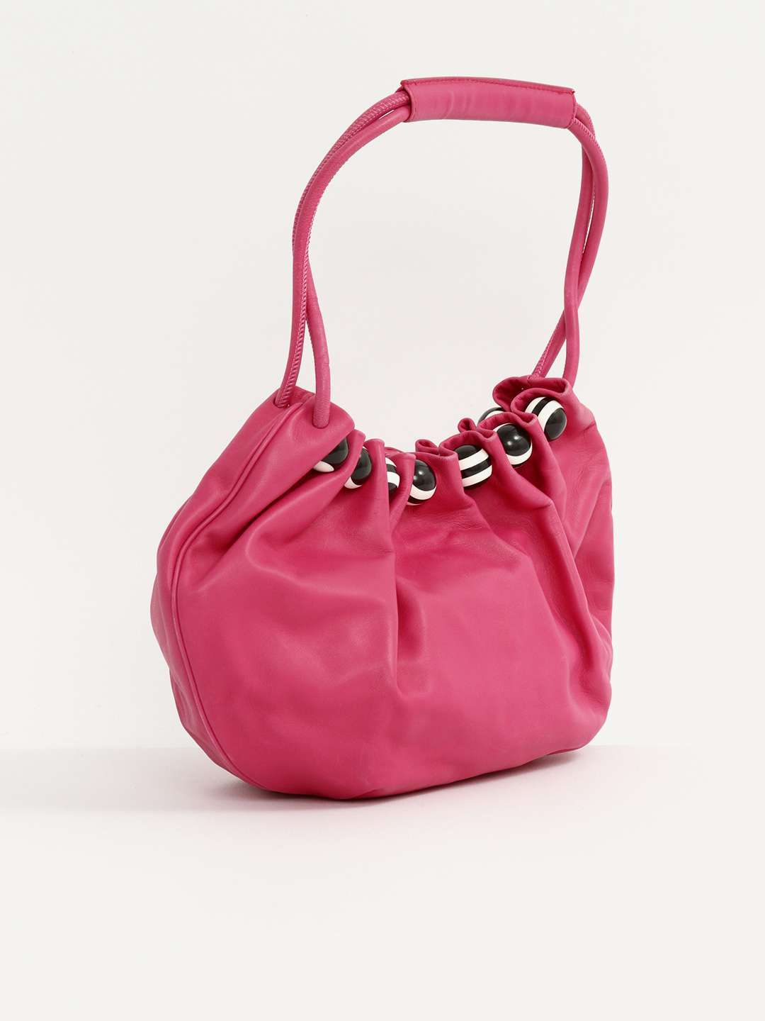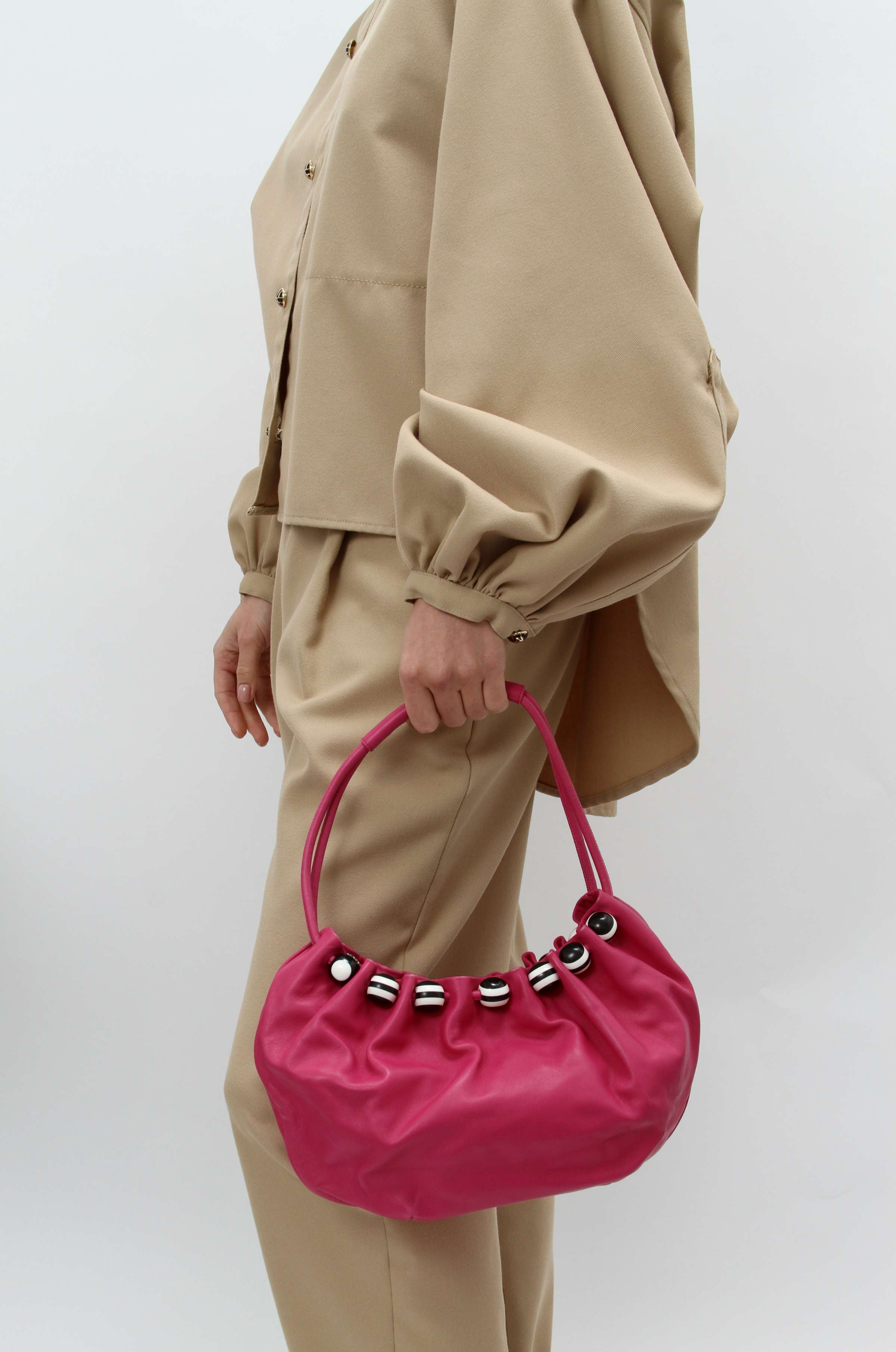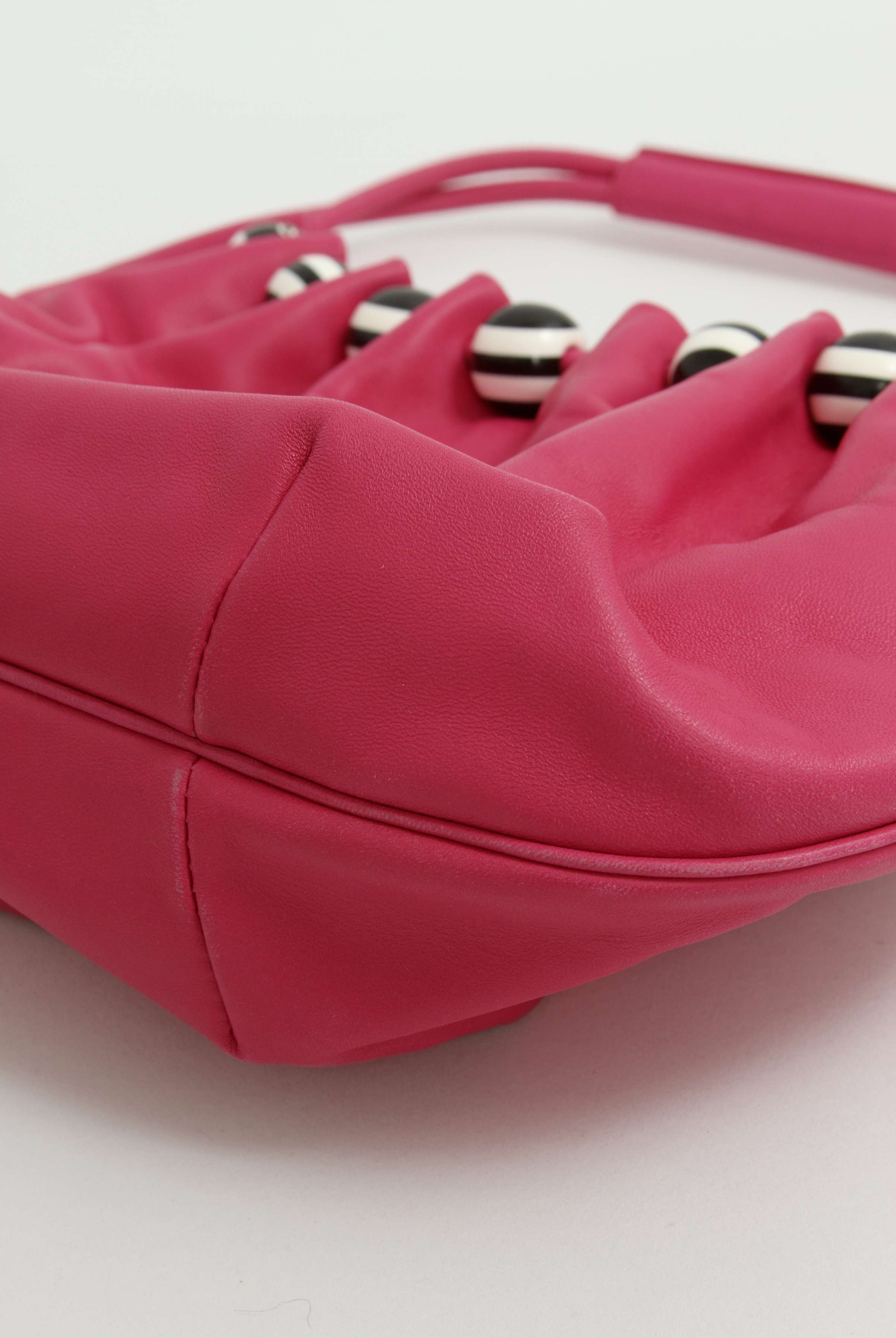 EscadaEscada Leather Bag. Модель выполнена из натуральной кожи, текстильная подкладка. Одно основное отделение, внутренний карман. Оснащена короткой ручкой. Украшена декоративными бусинами с логотипом бренда.