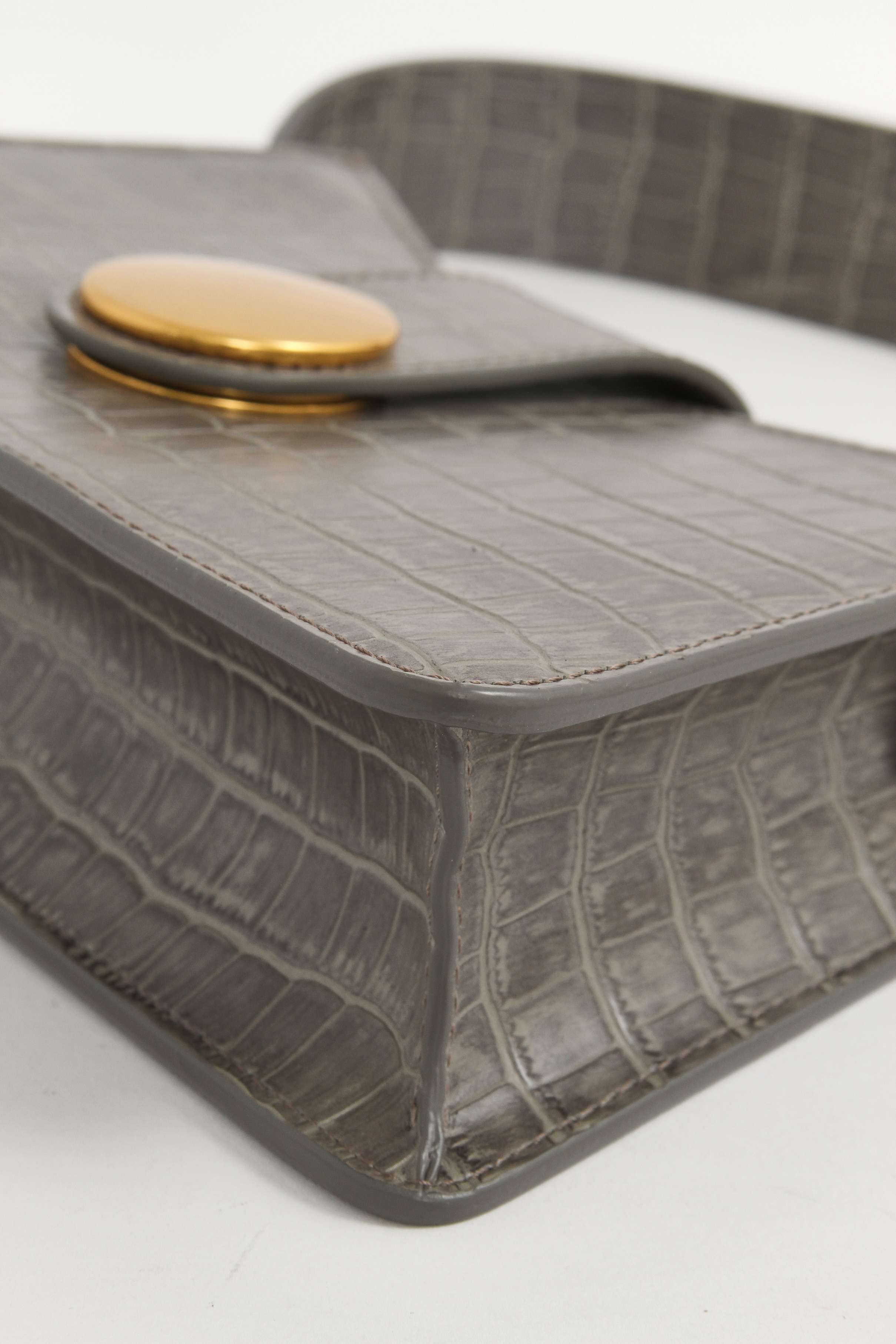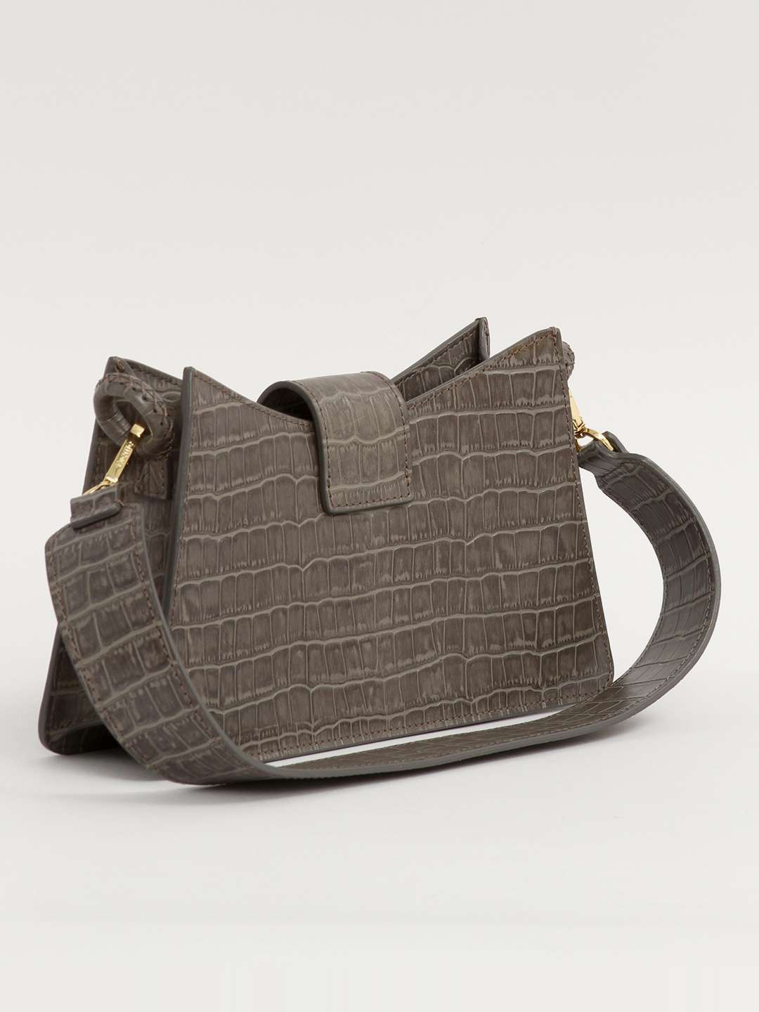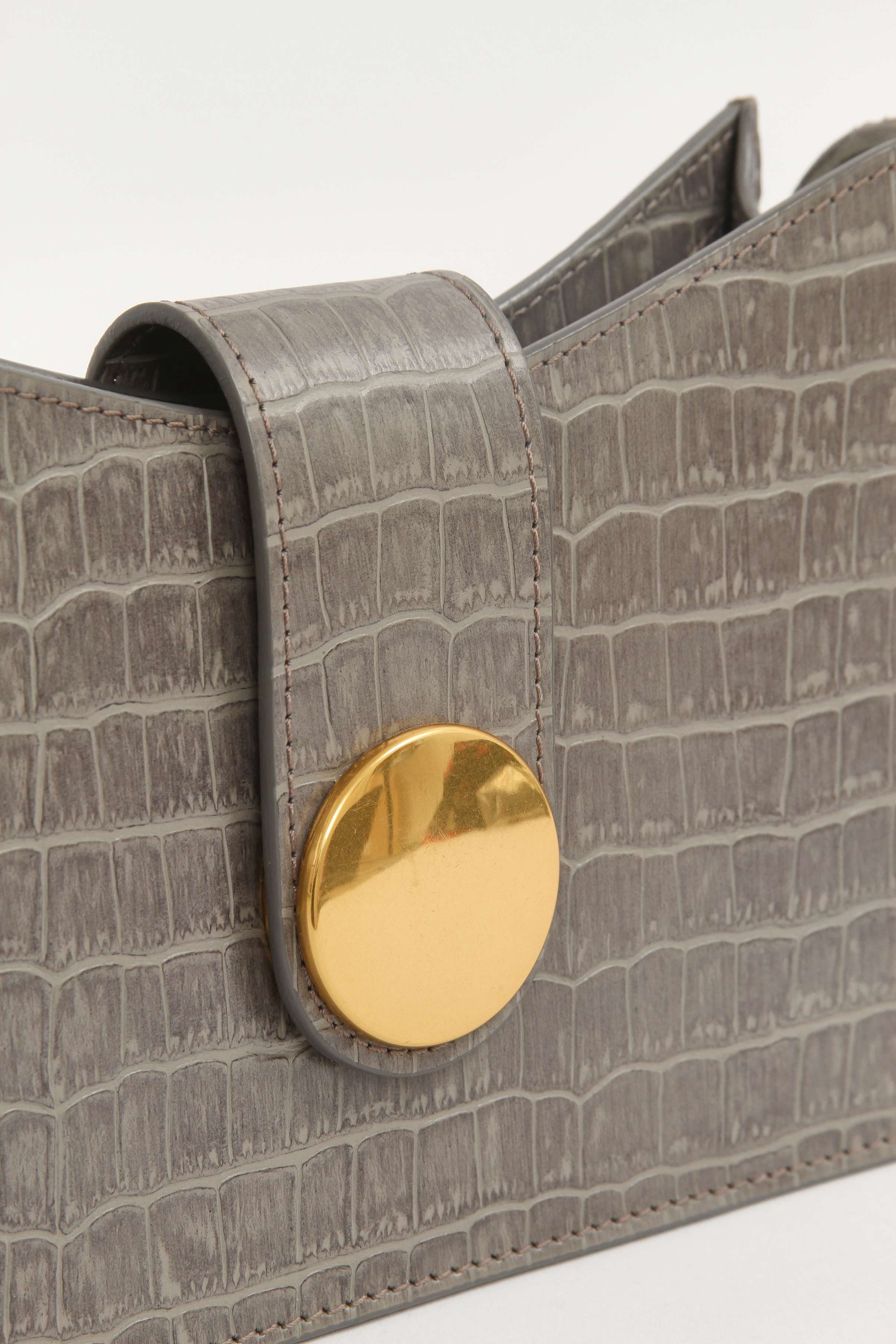EllemeElleme Baguette. Модель выполнена из натуральной кожи с тиснением под крокодила, подкладка из замши, золотистая фурнитура. Одно основное отделение, внутренний накладной карман. Оснащена широким плечевым ремнем. Украшена металлической застежкой.