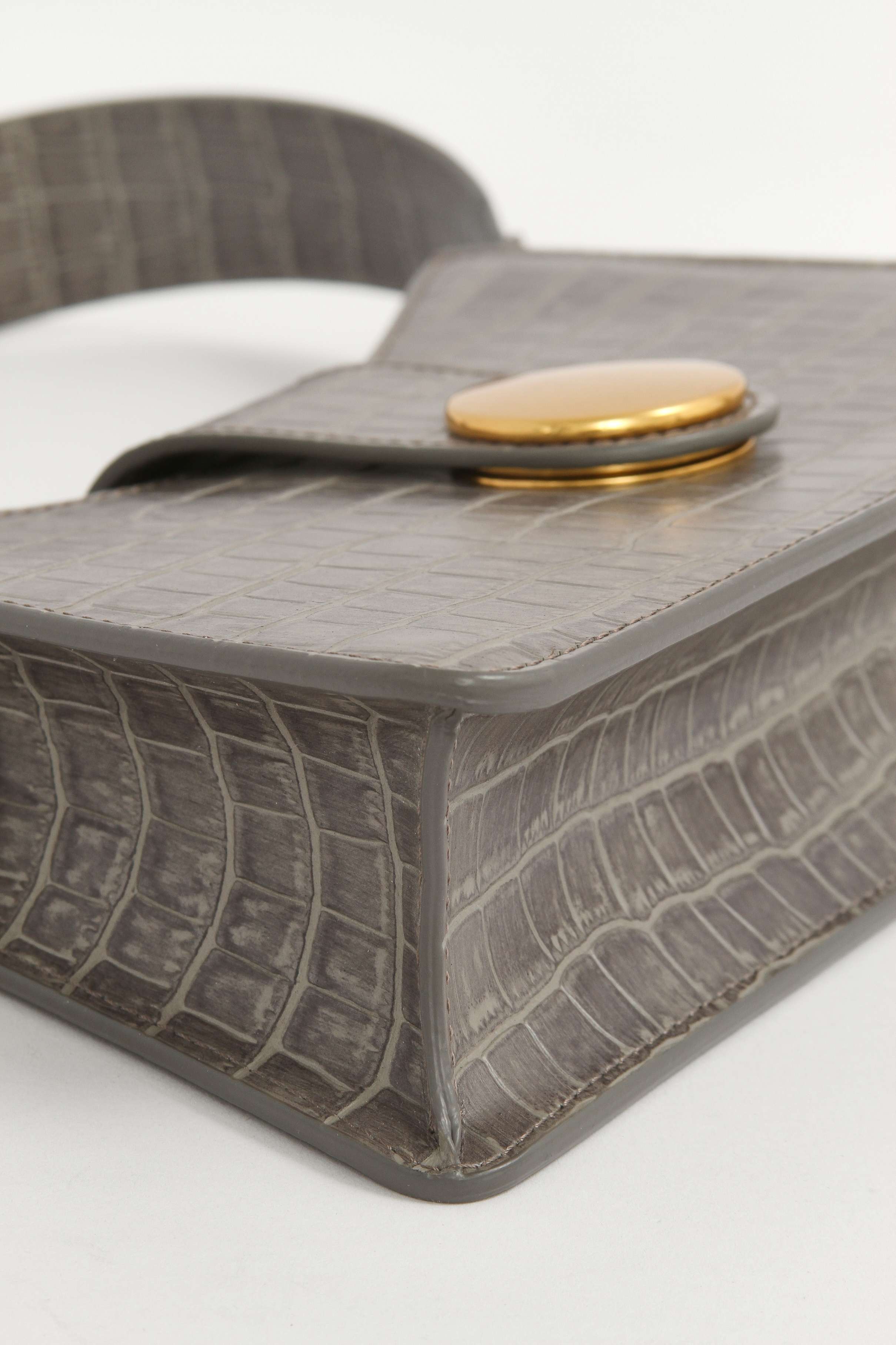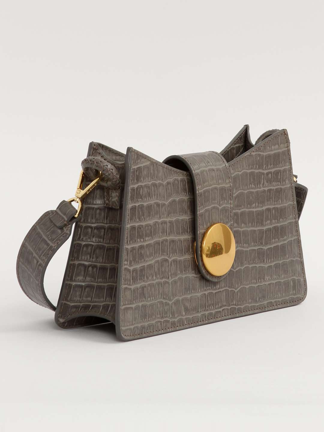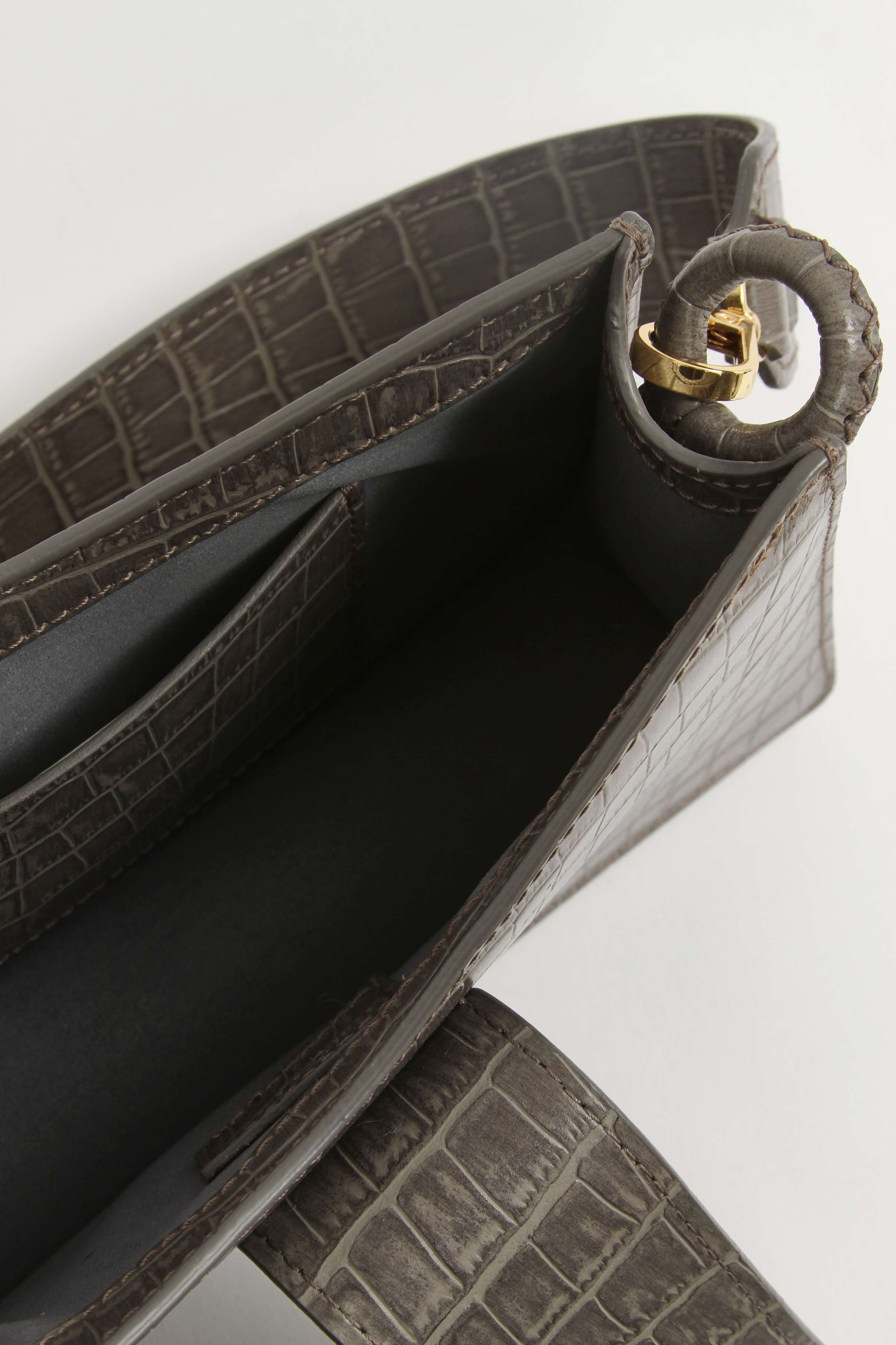 EllemeElleme Baguette. Модель выполнена из натуральной кожи с тиснением под крокодила, подкладка из замши, золотистая фурнитура. Одно основное отделение, внутренний накладной карман. Оснащена широким плечевым ремнем. Украшена металлической застежкой.