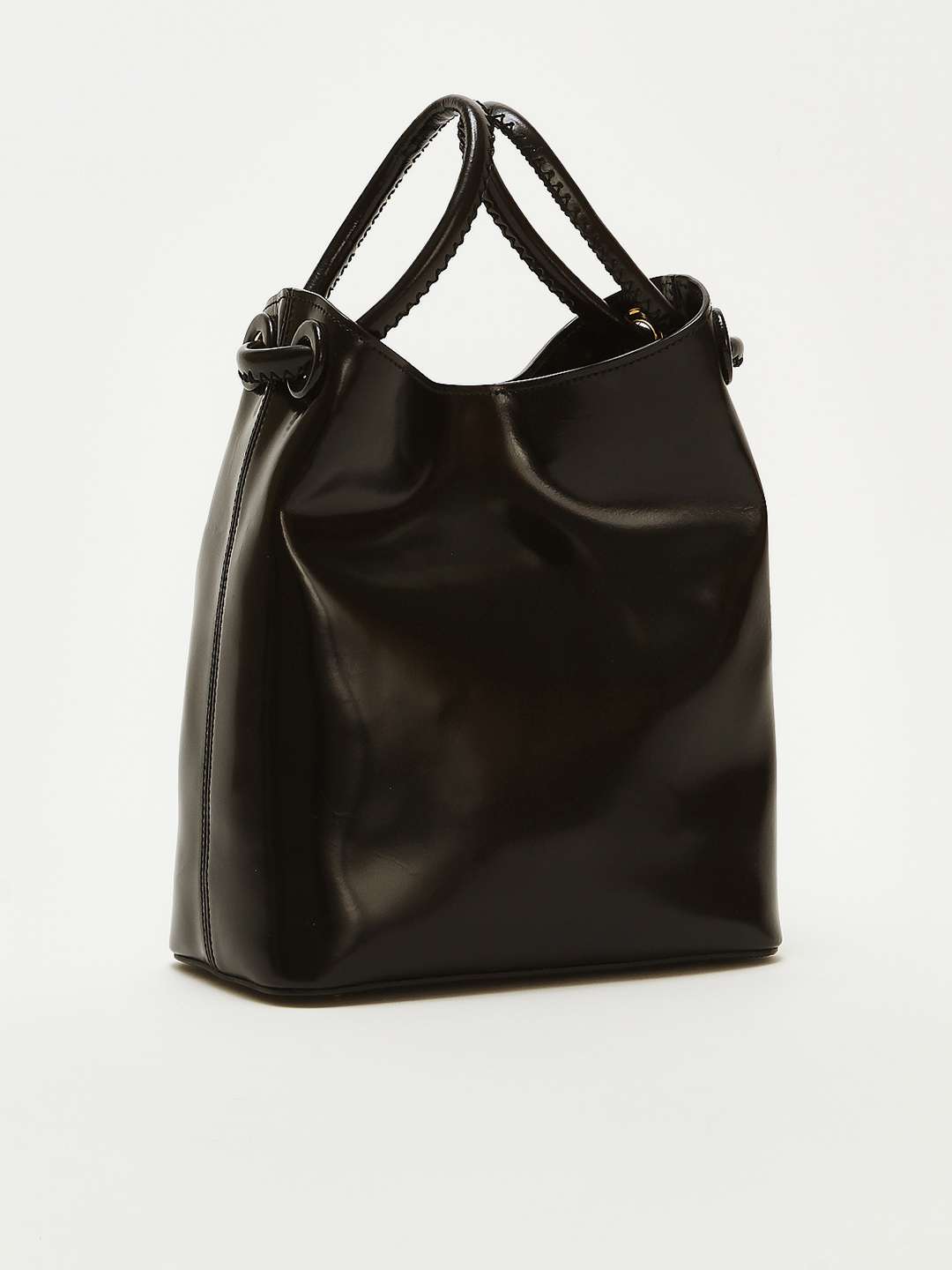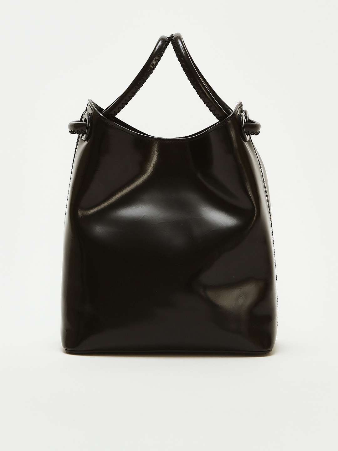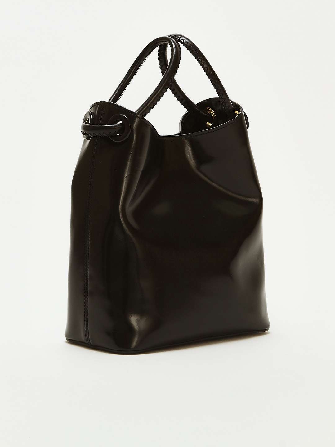 EllemeElleme Bucket Вместительная сумка Bucket от Elleme. Черный цвет, золотистая фурнитура. Модель выполнена из гладкой лаковой кожи, оснащена двумя круглыми ручками. Одно основное отделение и внутренние карманы. Закрывается на магнитную застежку. В комплекте съемный плечевой ремень с возможностью регулировки и фирменный пыльник.