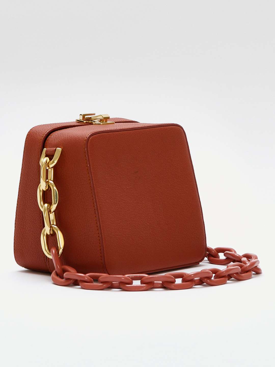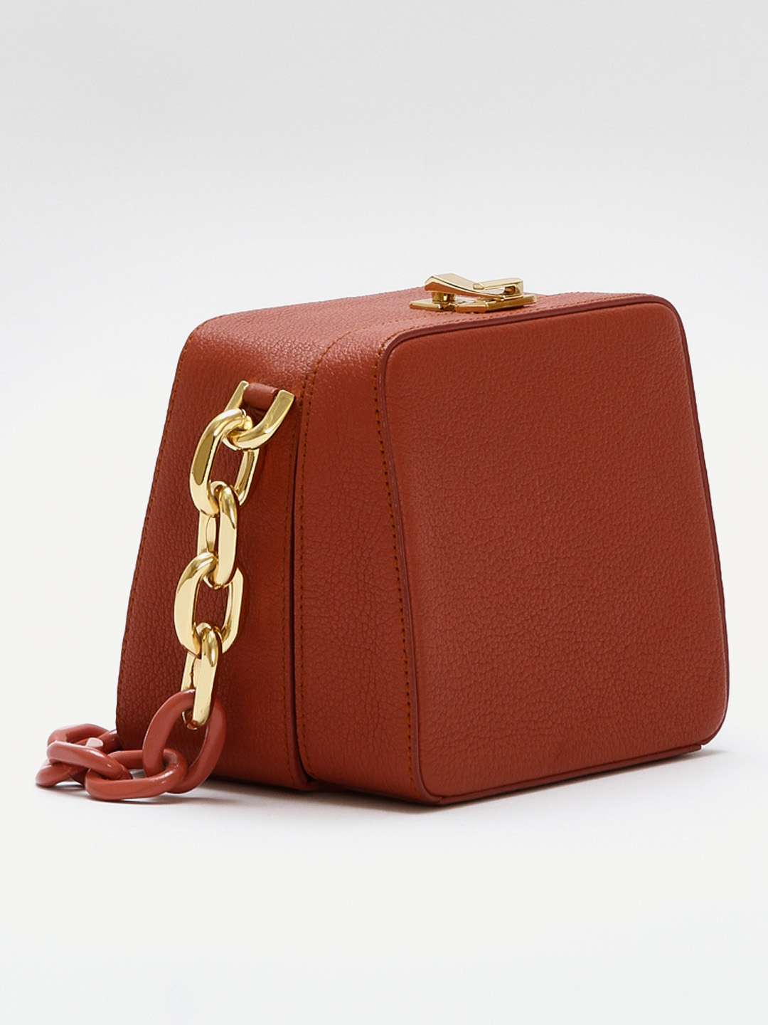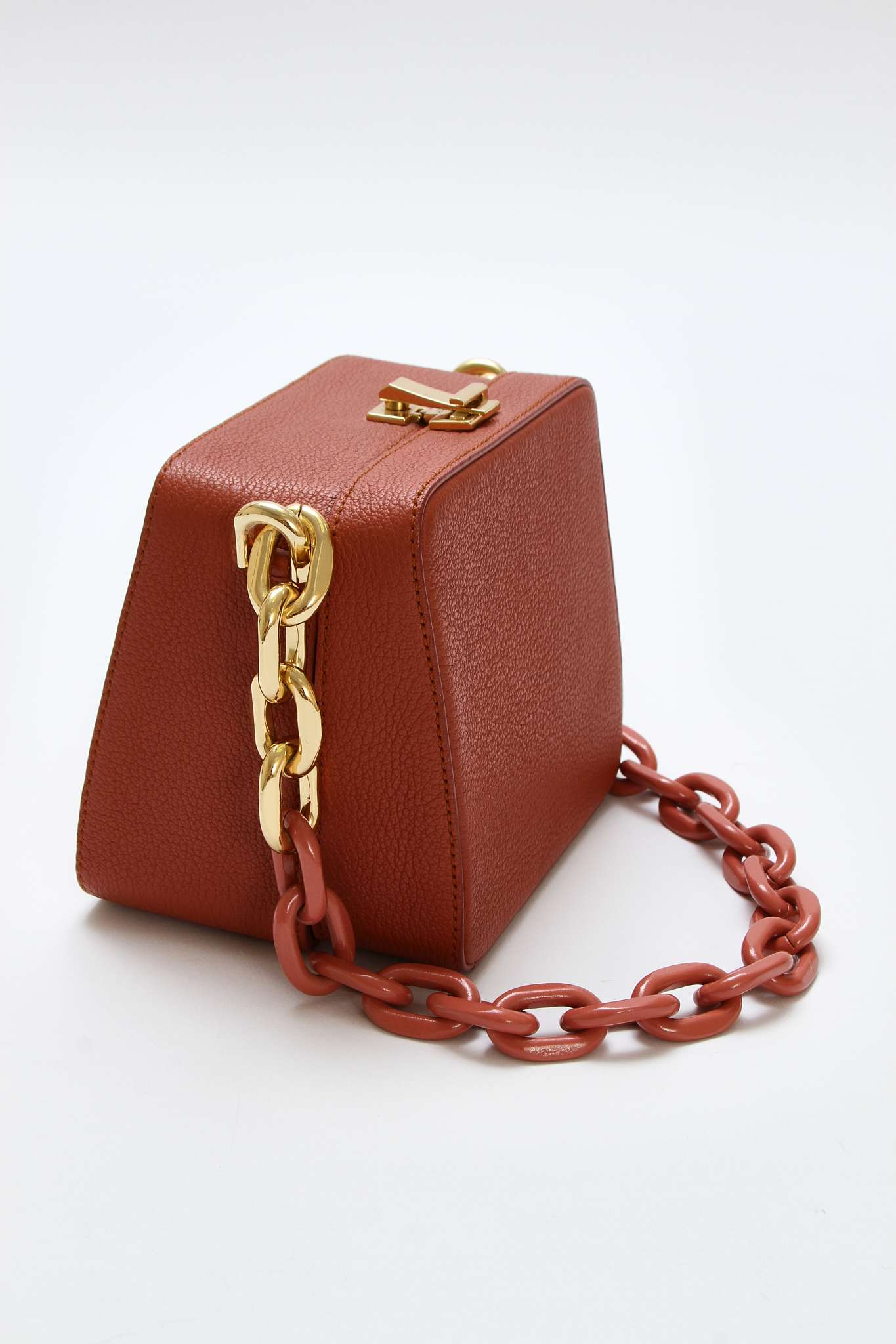The VolonThe Volon Cube. Модель выполнена из зернистой кожи, текстильная подкладка, золотистая фурнитура. Одно основное отделение, внутренний накладной карман. Оснащена верхней цепочкой с крупными звеньями. Есть нюанс: незначительные следы носки в основании сумки. Материал: Натуральная кожа.