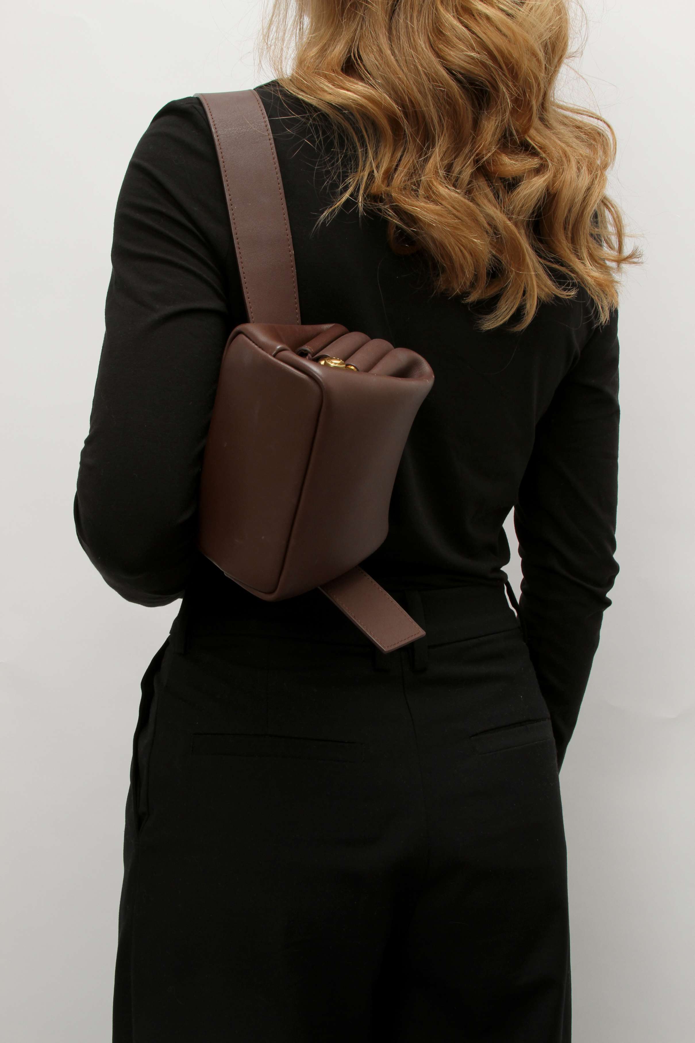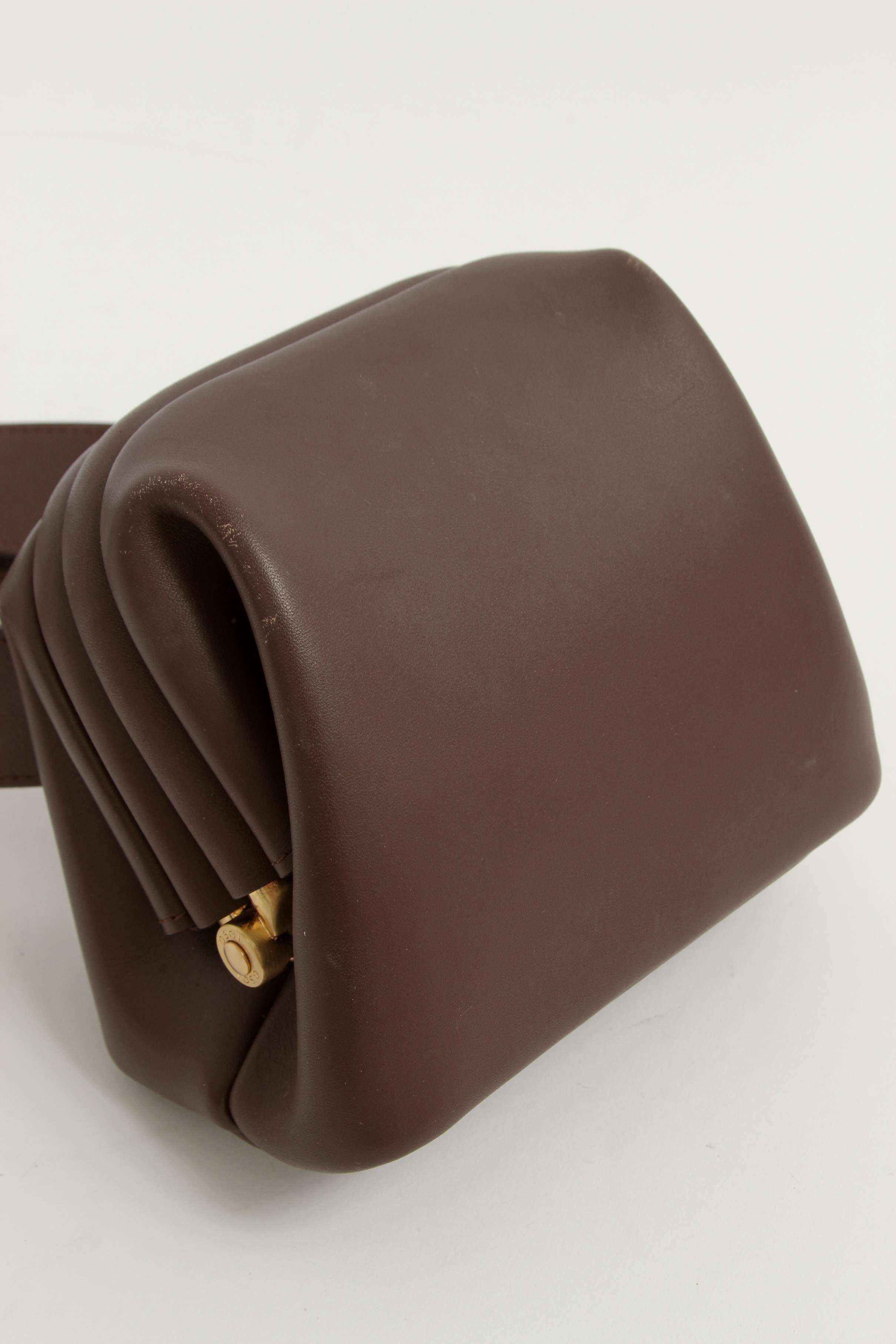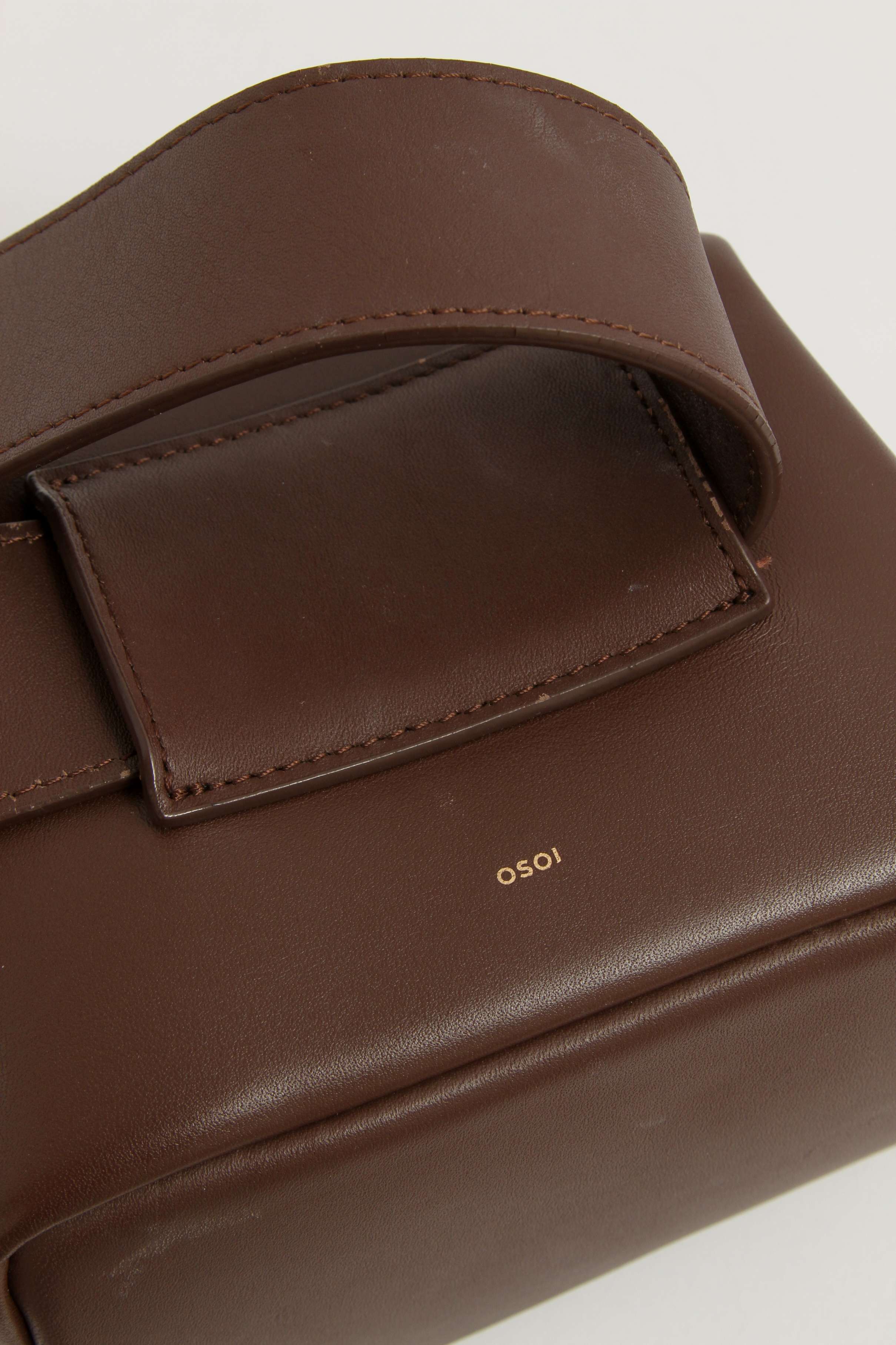 OsoiOsoi Brot. Модель выполнена из натуральной кожи, текстильная подкладка, золотистая фурнитура. Одно основное отделение, деления для карт. Оснащена широким поясным ремнем. Украшена тисненым логотипом бренда.