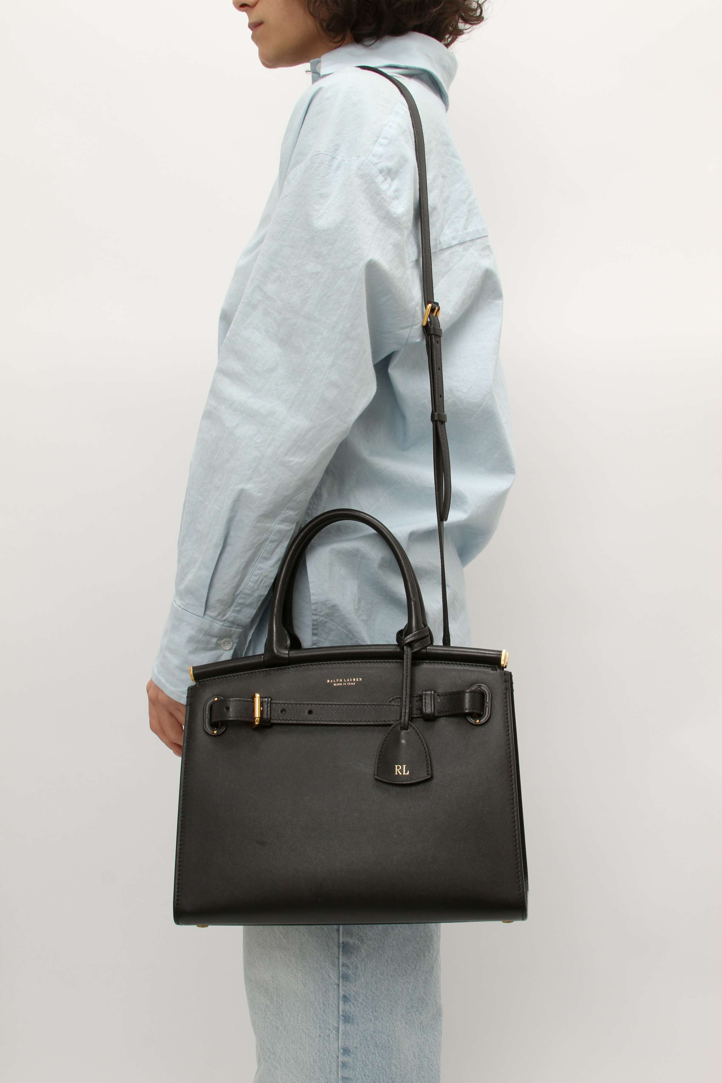 Ralph LaurenRalph Lauren RL50. Модель выполнена из натуральной кожи, подкладка из кожи, золотистая фурнитура. Одно основное отделение, внутренний карман. Оснащена двумя верхними ручками и съемным плечевым ремнем. Защитные ножки в основании сумки. Украшена кожаным брелоком и логотипом бренда.
