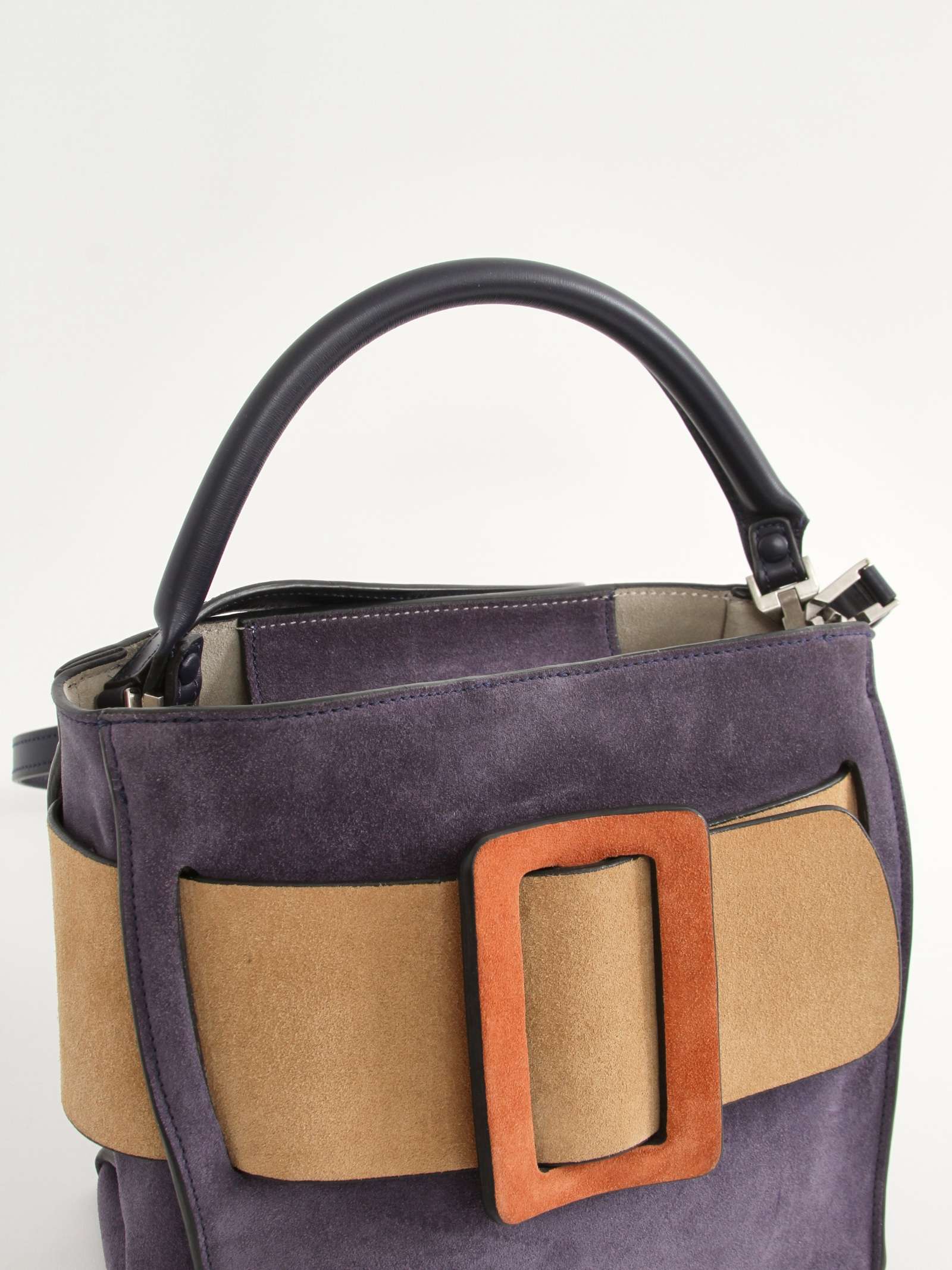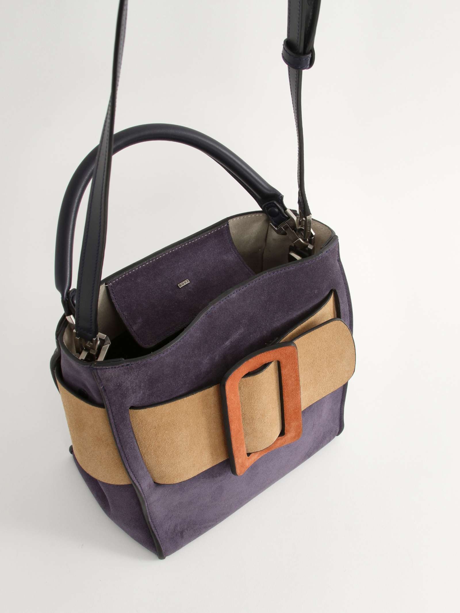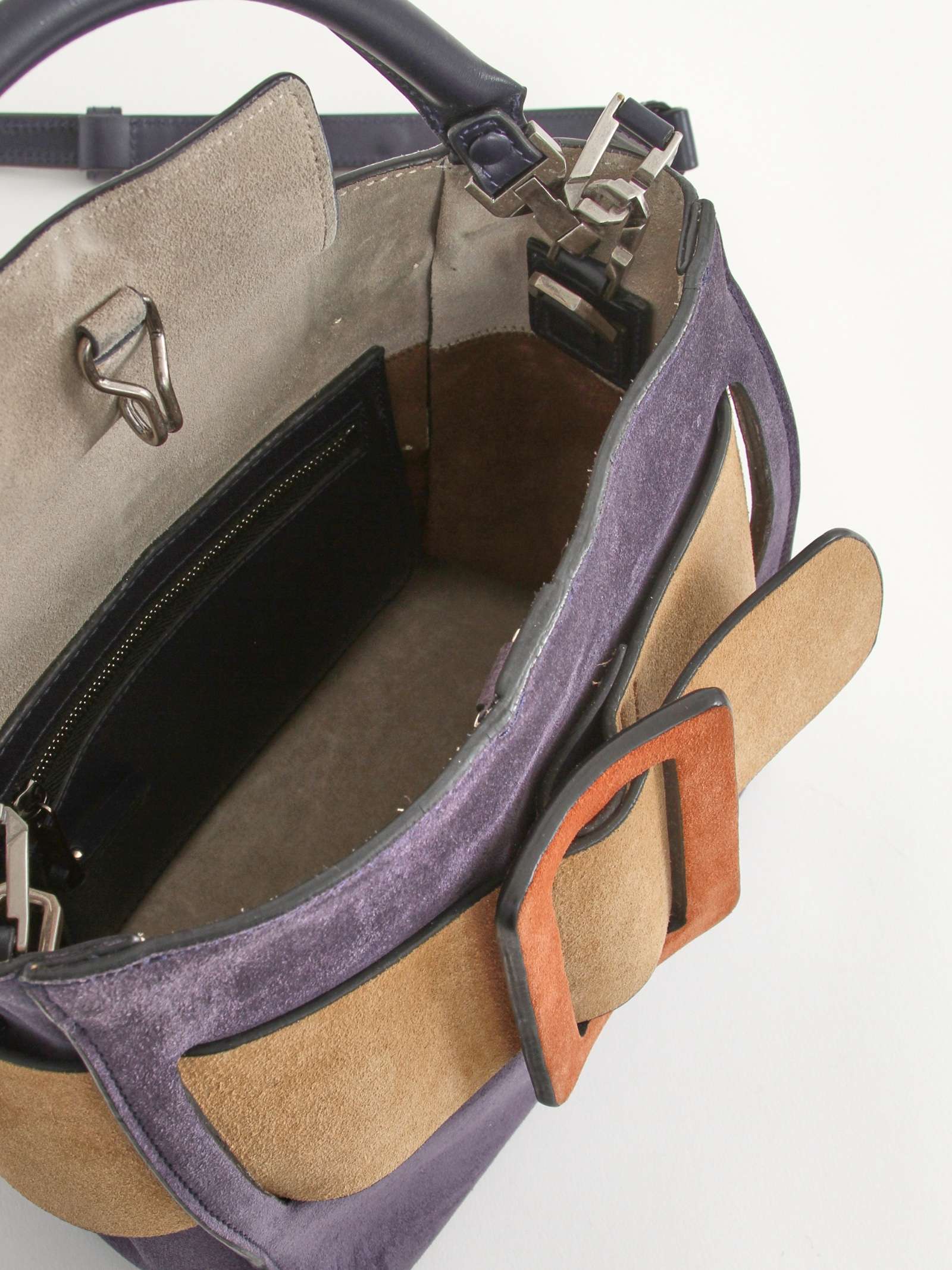 BOYYBOYY Bobby. Модель выполнена из замши, подкладка из замши, серебристая фурнитура. Одно основное отделение, внутренний карман на молнии, внутренний накладной карман. Оснащена короткой ручкой из кожи и съемным плечевым ремнем. Украшена ремнем и пряжкой из замши. Комплект: Съемный ремень. Материал: Замша. Есть нюанс: незначительные следы носки на подкладке.