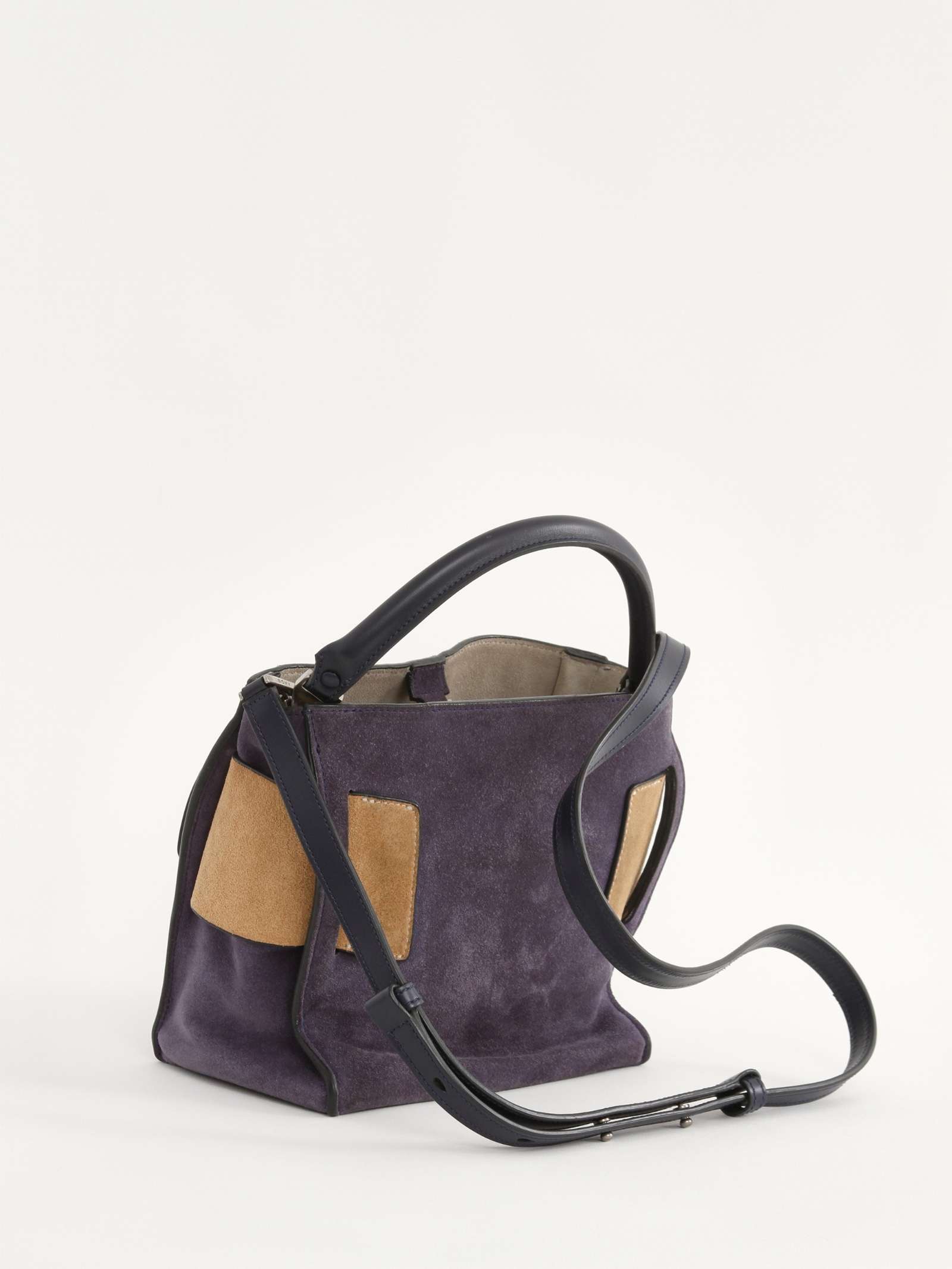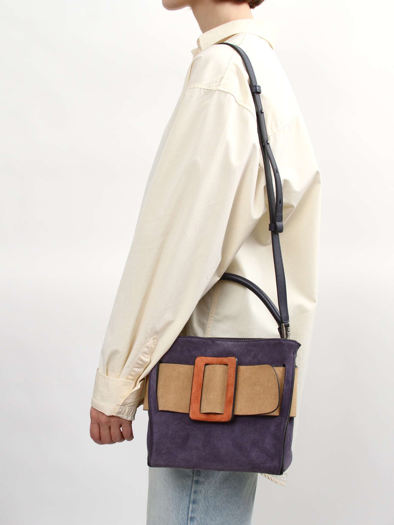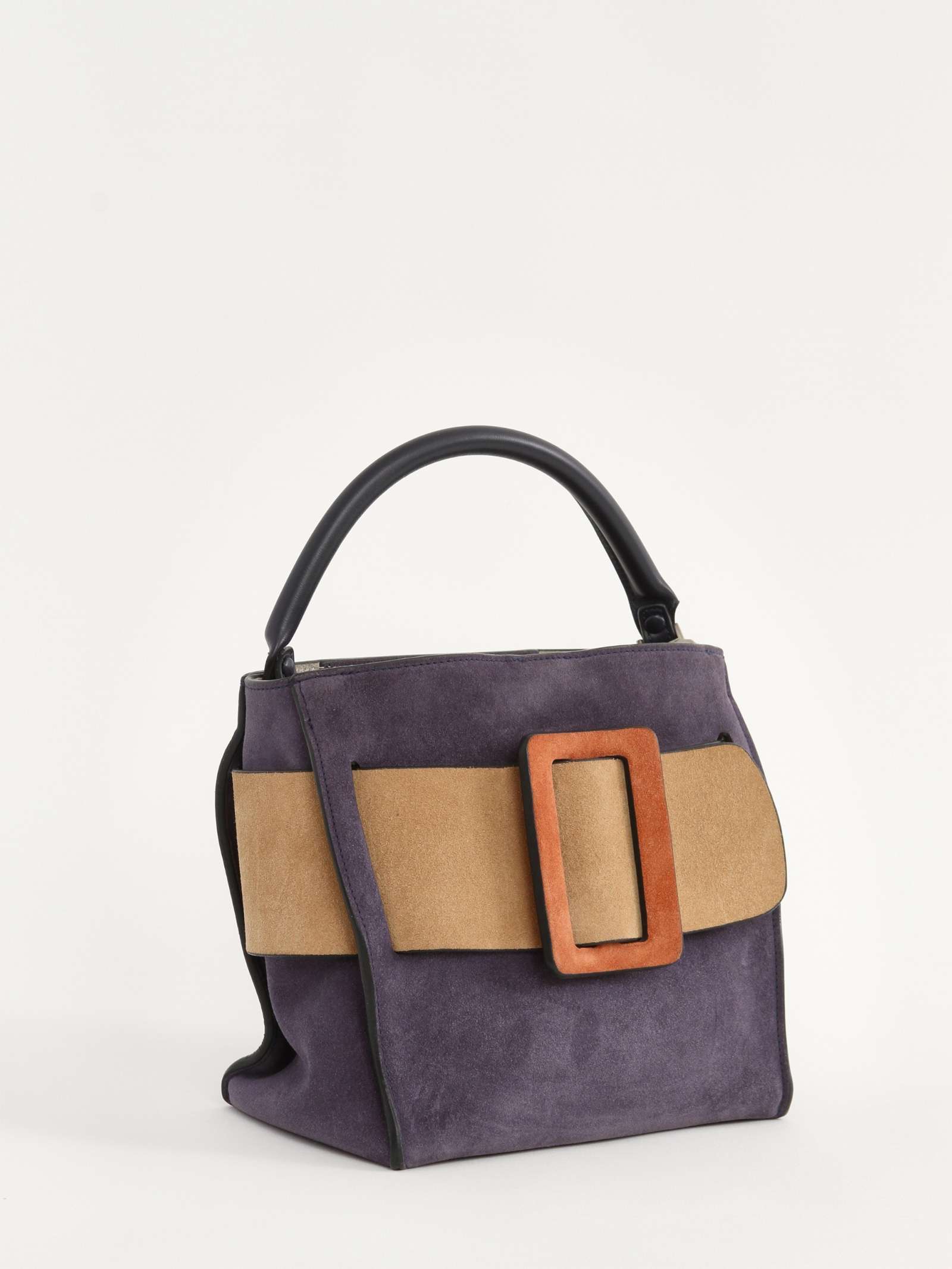BOYYBOYY Bobby. Модель выполнена из замши, подкладка из замши, серебристая фурнитура. Одно основное отделение, внутренний карман на молнии, внутренний накладной карман. Оснащена короткой ручкой из кожи и съемным плечевым ремнем. Украшена ремнем и пряжкой из замши. Комплект: Съемный ремень. Материал: Замша. Есть нюанс: незначительные следы носки на подкладке.